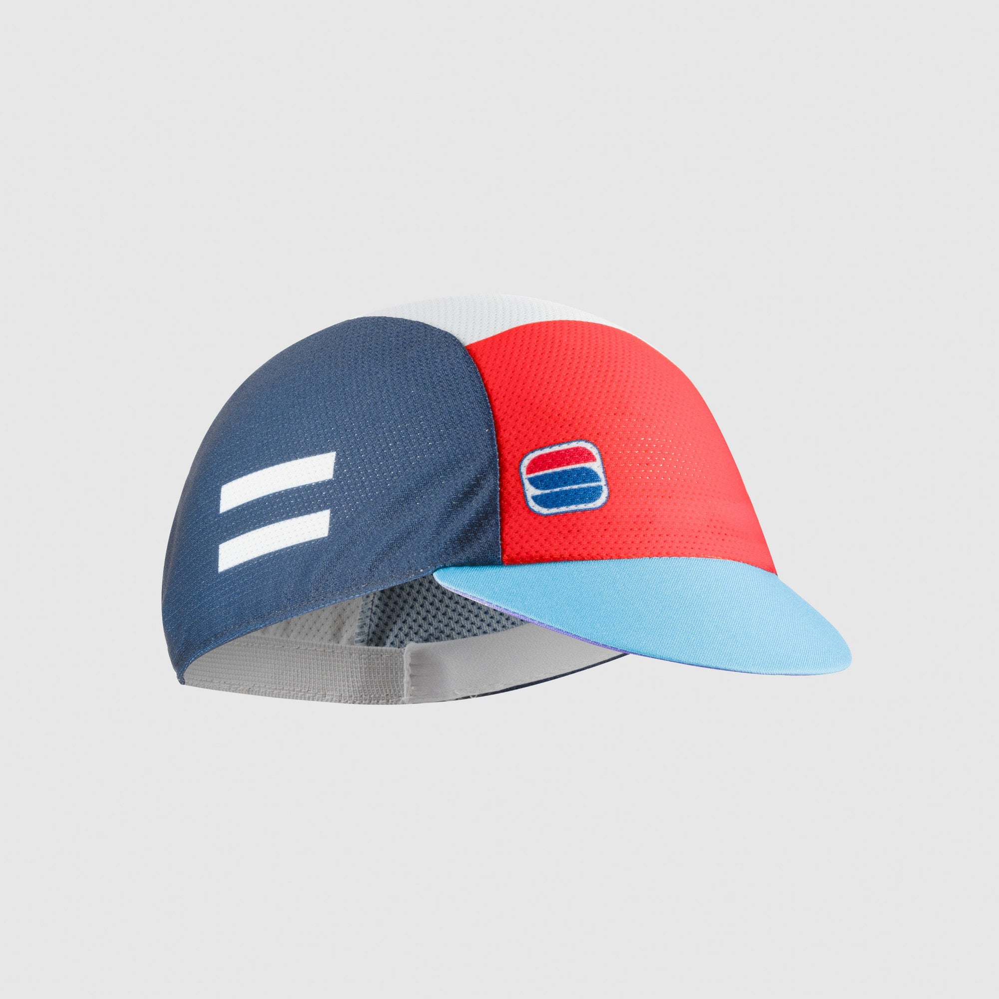 - A cycling cap with a Roubaix colour scheme, three-piece construction and a peaked rim